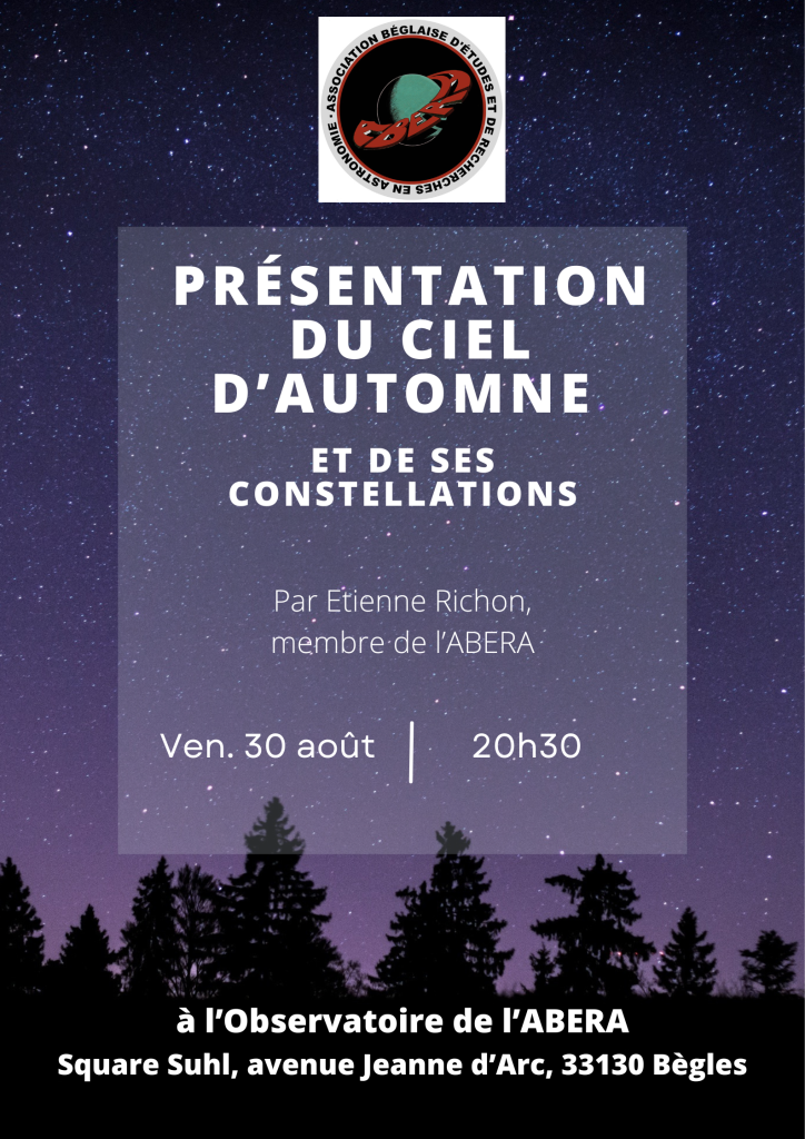 Etienne Richon, membre de l’ABERA nous présentera le ciel et les constellation d’automne, suivi si la météo le permet d’une observation.